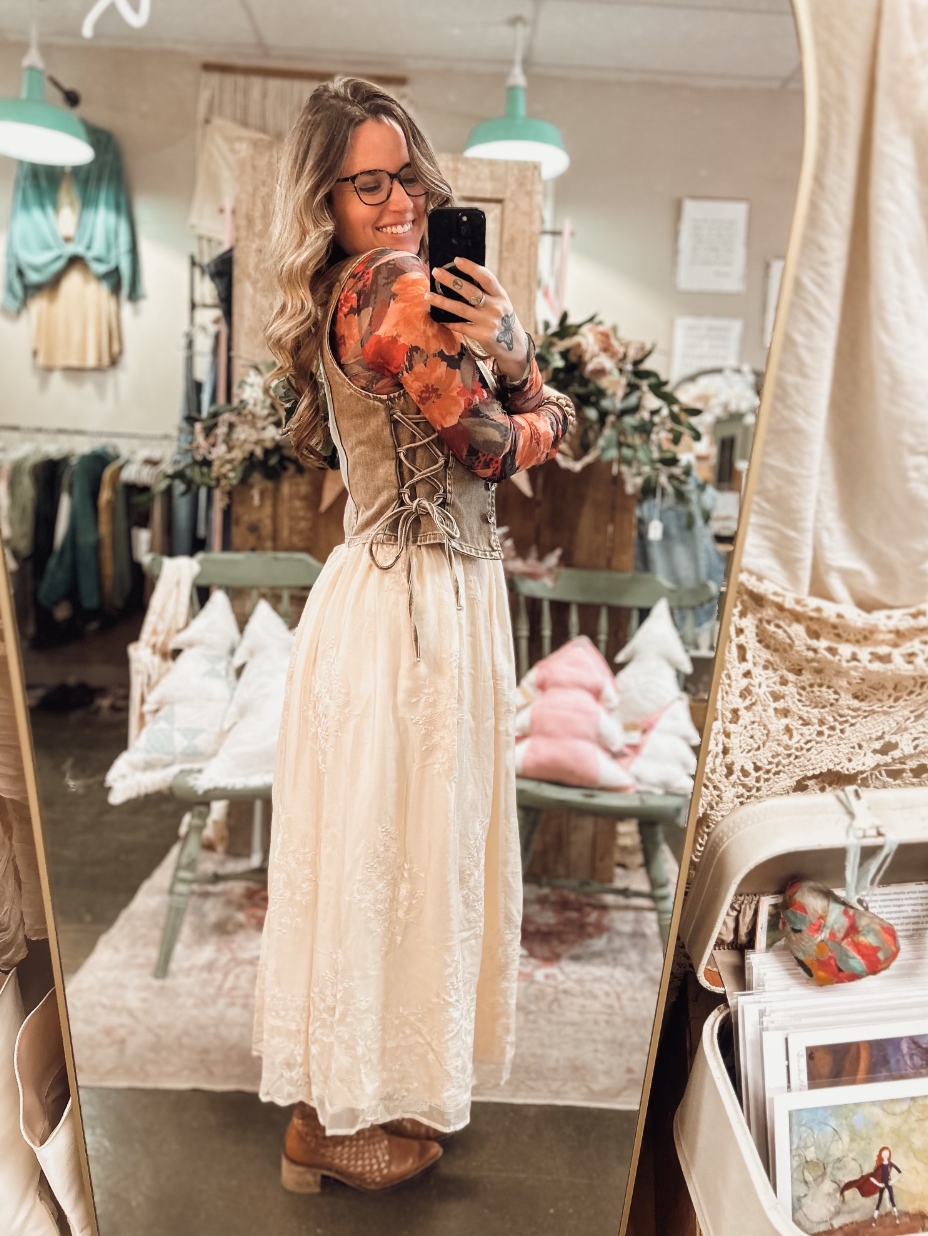 Home / Bottoms (Hull St) / Mesh Overlay Oatmeal Skirt